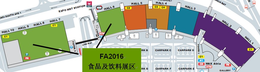 FHA2016展厅位于新加坡博览中心1-10号馆,其中FA2016食品及饮料展区位于6、7、8、9号整馆及10号馆的一部分。